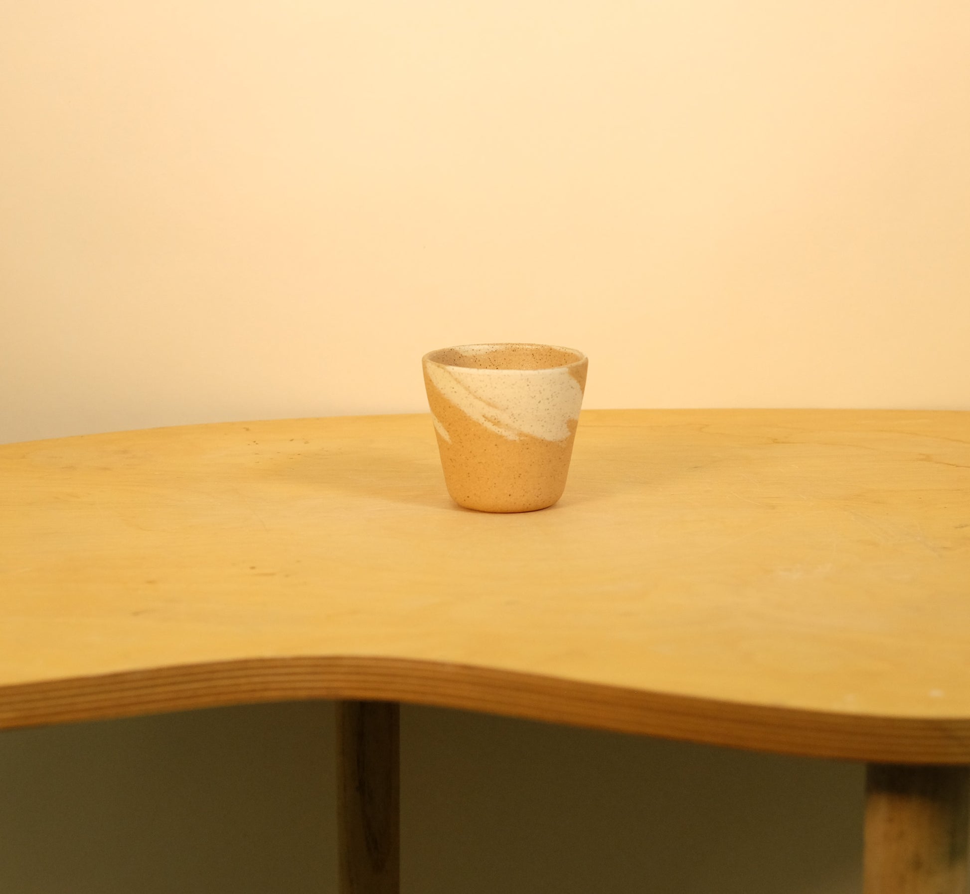 Speckled brown clay with splashes of speckled cream clay. Hand thrown and glazed interior. The cup body exterior is sanded raw clay.