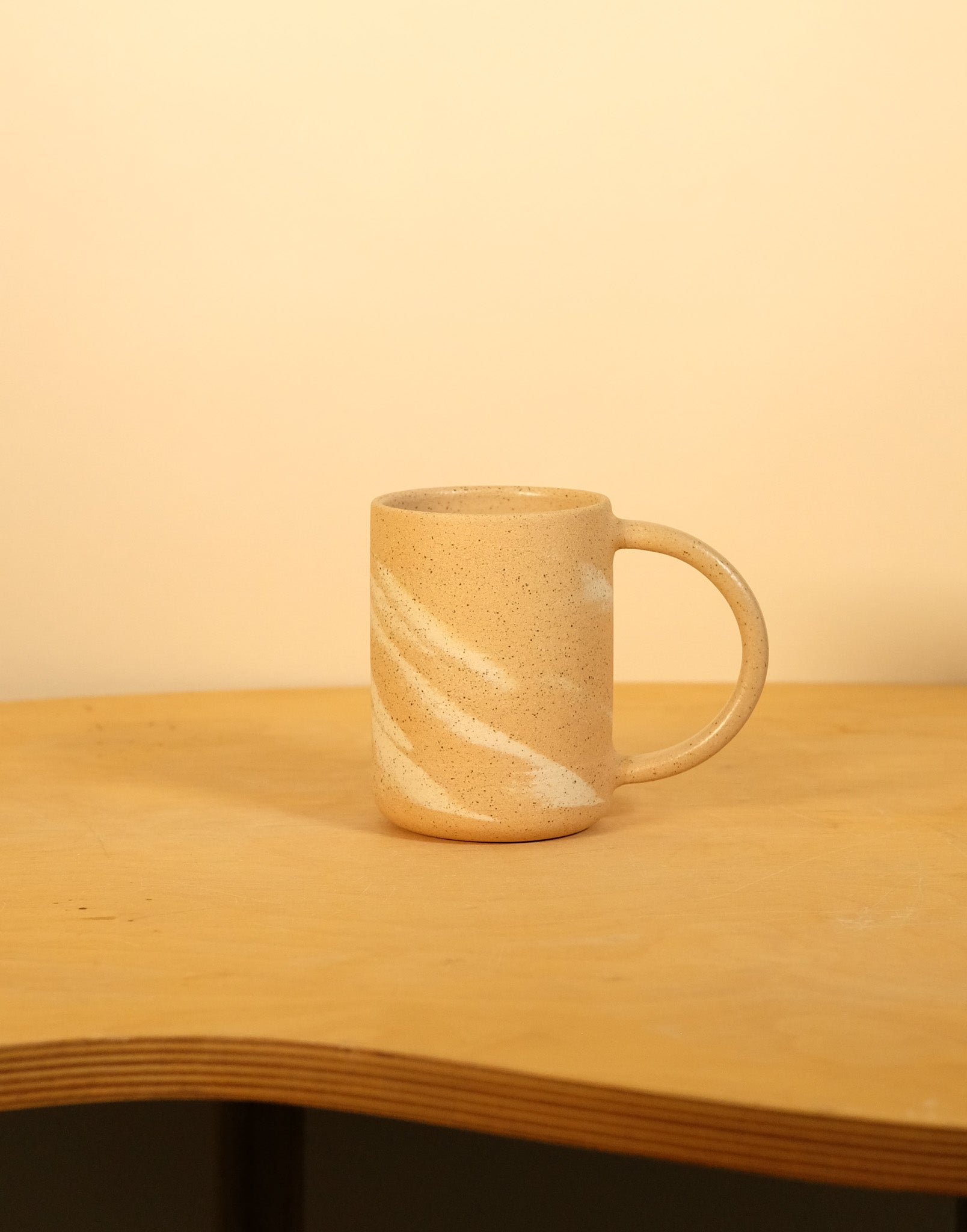 Speckled brown clay with splashes of speckled cream clay. Hand thrown and glazed interior and handle. The mug body exterior is sanded raw clay.