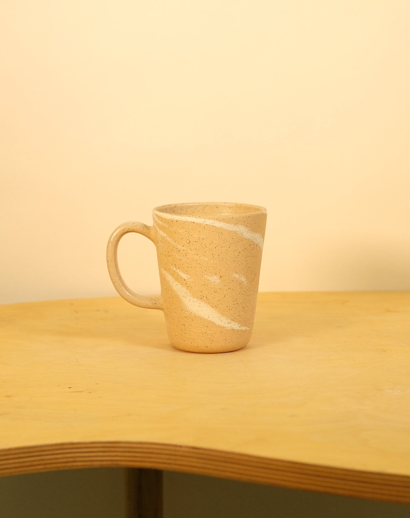 Speckled brown clay with splashes of speckled cream clay. Hand thrown and glazed interior and handle. The mug body exterior is sanded raw clay.
