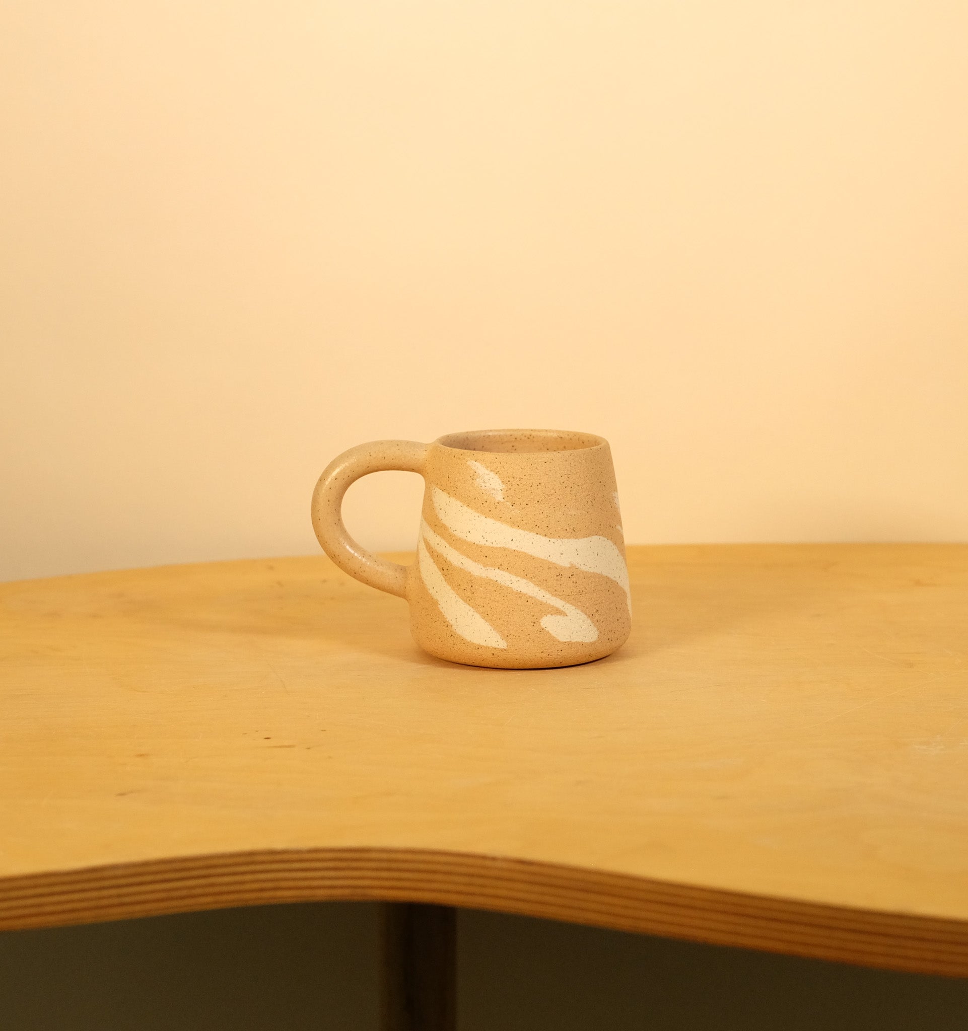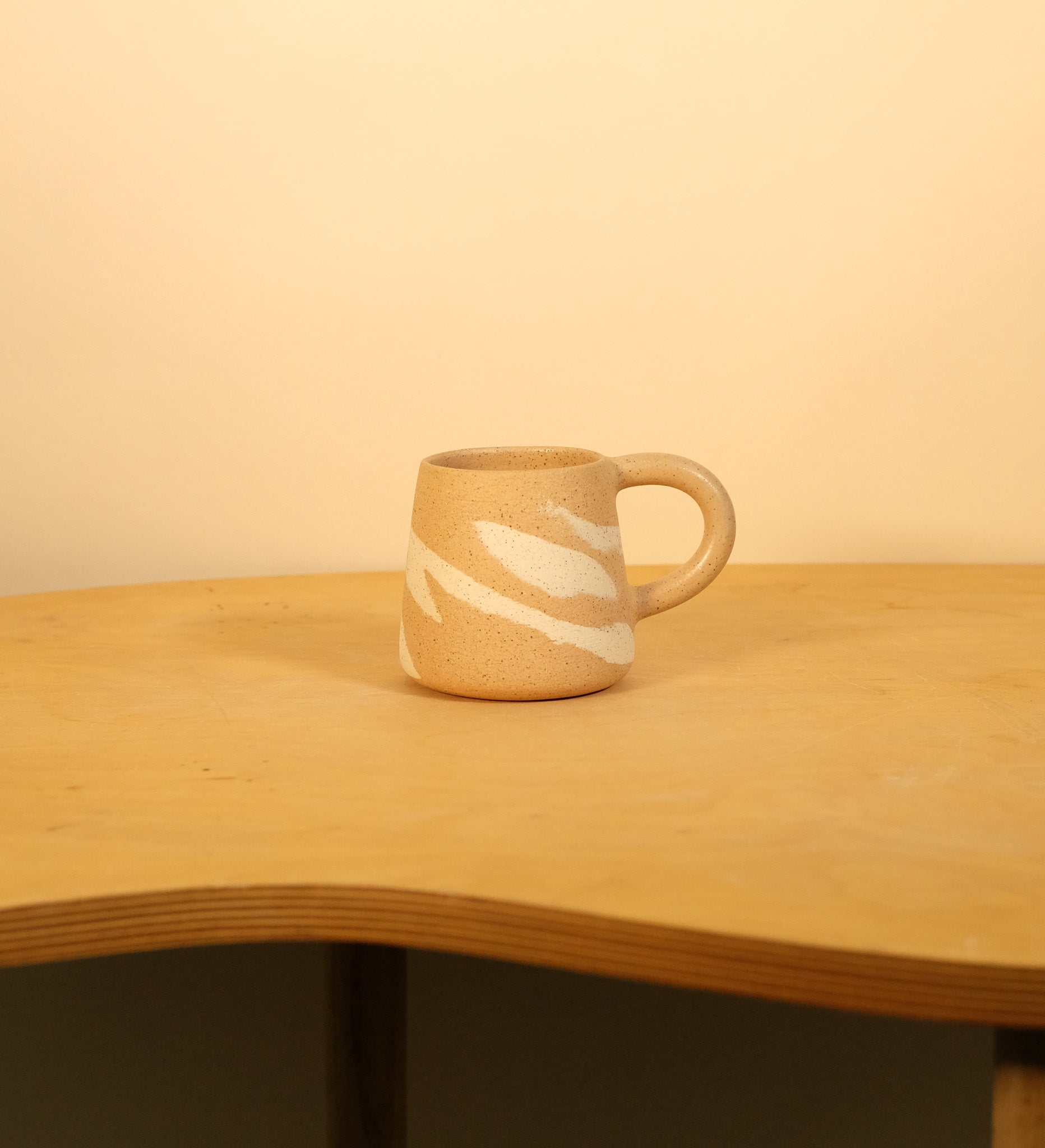 Speckled brown clay with splashes of speckled cream clay. Hand thrown and glazed interior and handle. The mug body exterior is sanded raw clay.