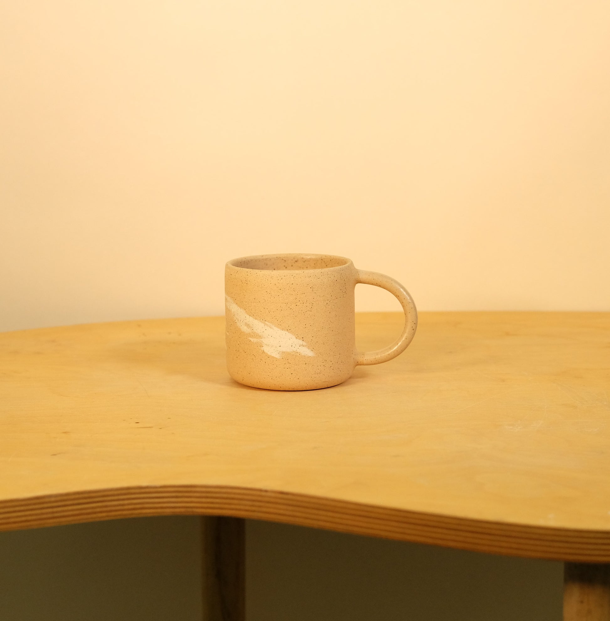Speckled brown clay with splashes of speckled cream clay. Hand thrown and glazed interior and handle. The mug body exterior is sanded raw clay.