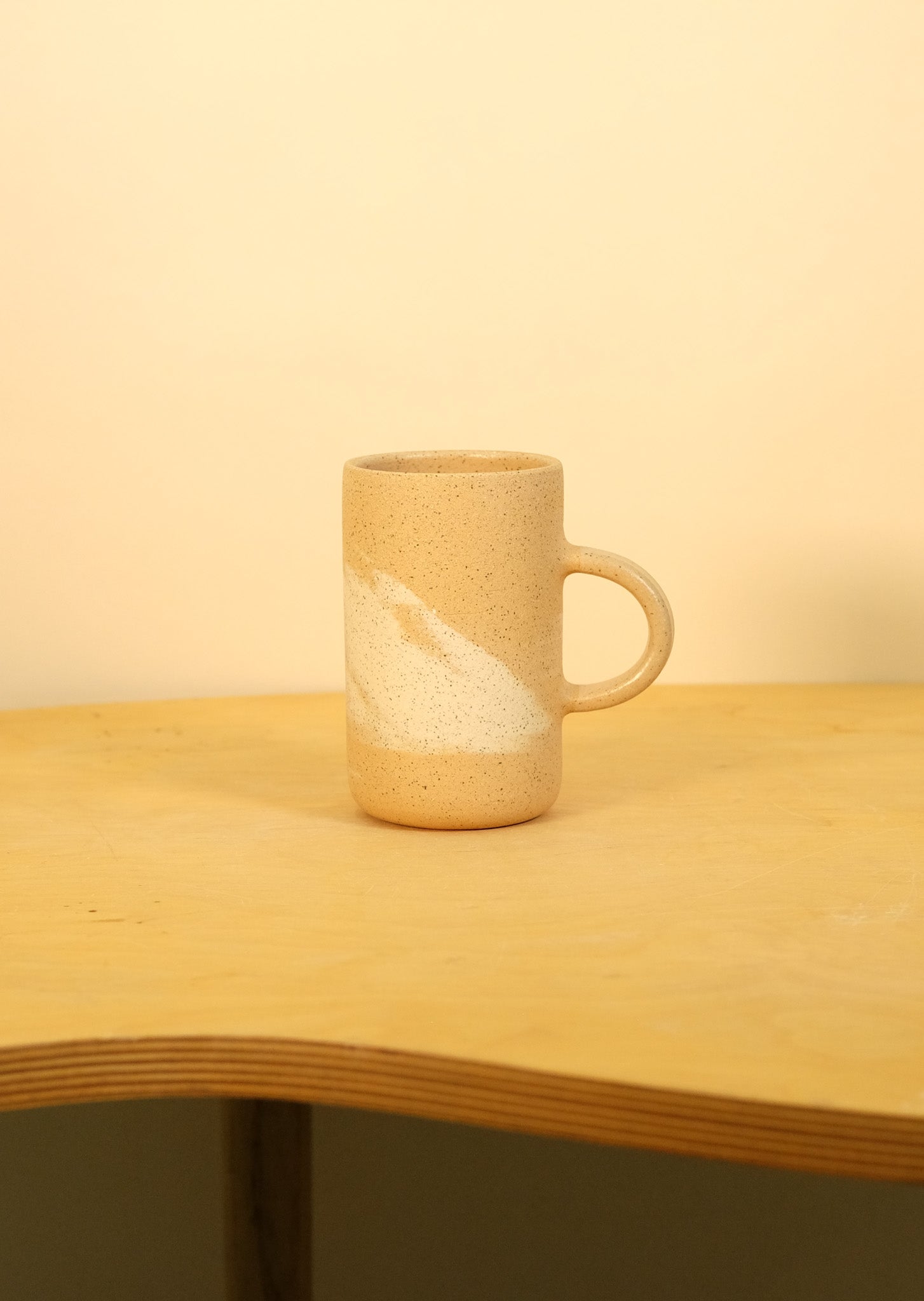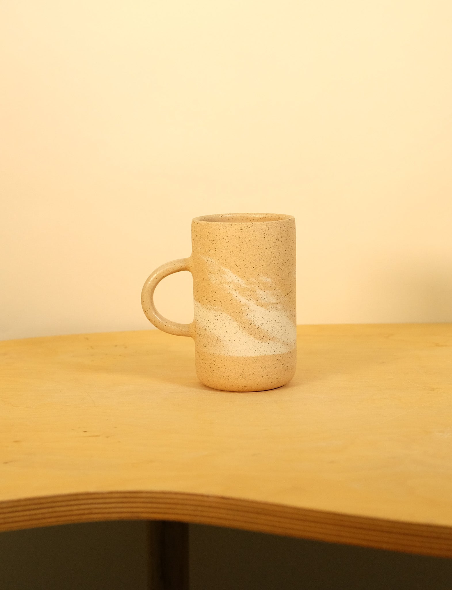 Speckled brown clay with splashes of speckled cream clay. Hand thrown and glazed interior and handle. The mug body exterior is sanded raw clay.