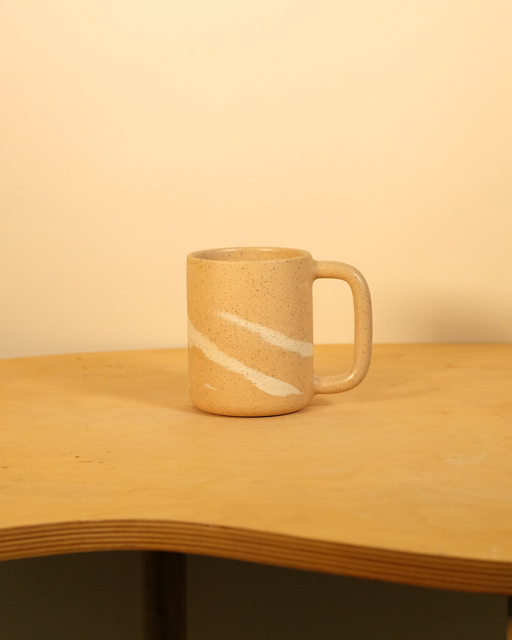 Speckled brown clay with splashes of speckled cream clay. Hand thrown and glazed interior and handle. The mug body exterior is sanded raw clay.