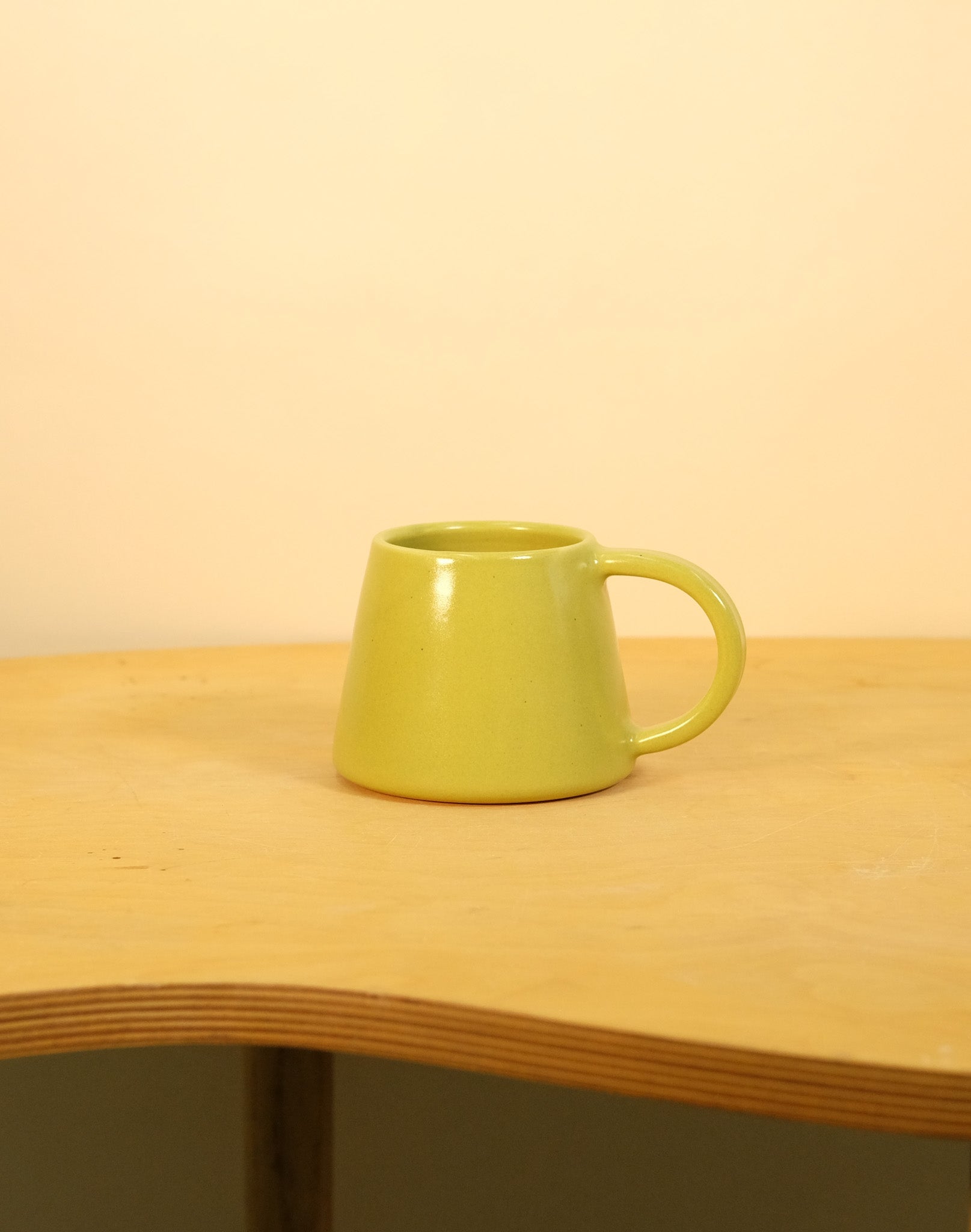 Olivey green mug. Hand thrown with a silky semi matte glaze, this color is a bit shinier than the others.